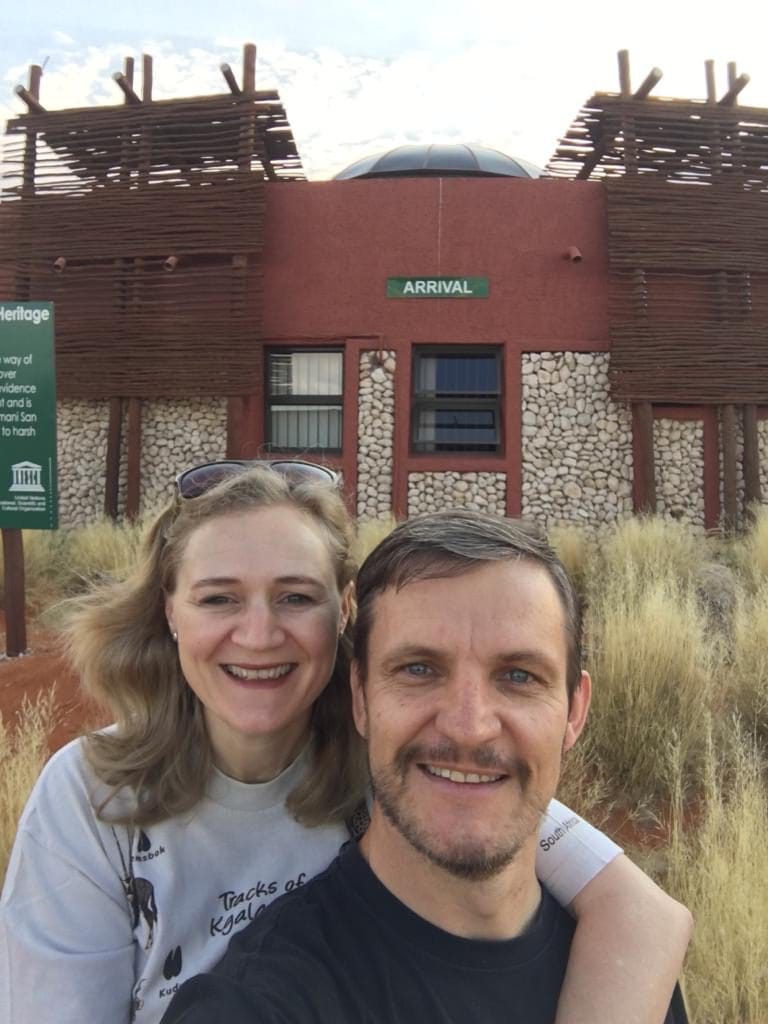 Vir die wat nog nie by van die Kgalagadi se piekniek plekke was nie, moet ek net eers verduidelik. Die geriewe het ‘n gewone hout deur buite die toilet. Maar jy wil mos nou nie in leeu se kind vasloop as jy daardie deur oopmaak nie? So daar is ‘n traliehek wat oop en toe rol, met houtjies tussen die tralies, sodat jy darem die omgewing kan bespied, voor jy die pad na jou voertuig toe aanpak.