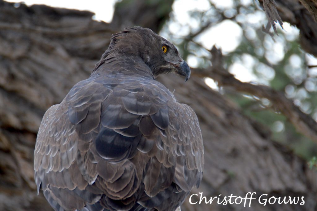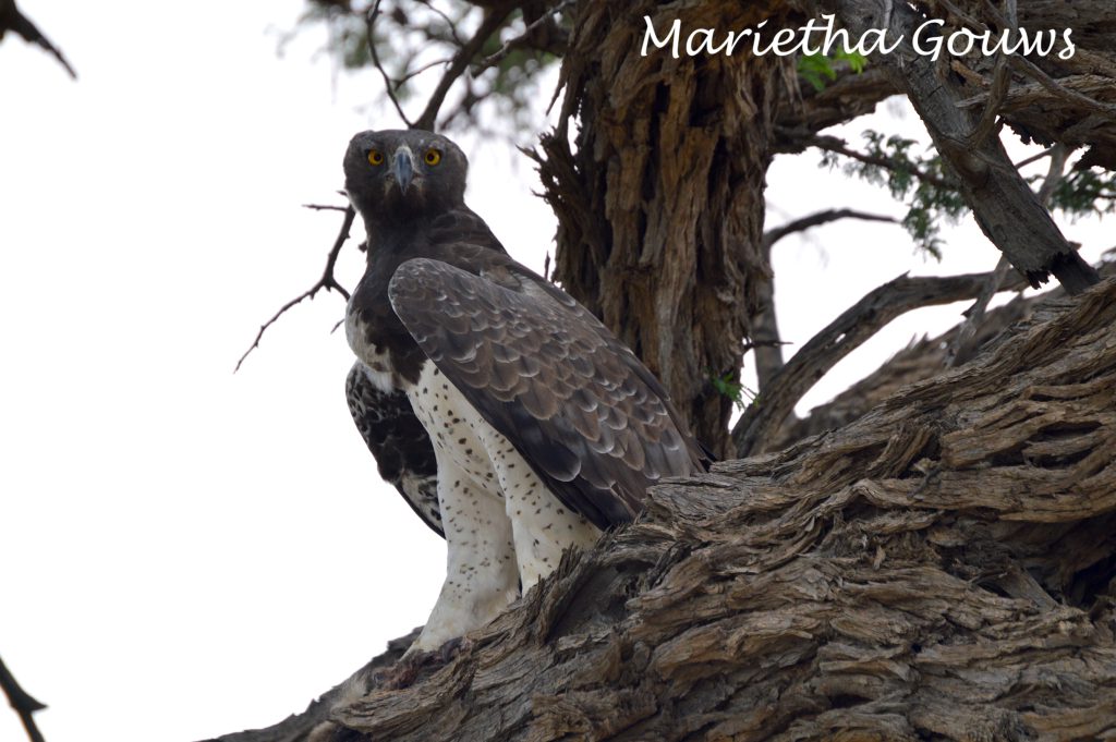 Daar was nog ‘n paar volstruise – met kleintjies – by Cheleka, maar Kaspersdraai het niks opgelewer nie. Voor ons weggedraai het na Marie se Draai, was daar ‘n bruin arend op ‘n tak. Die boom was egter ‘n ent van die pad af. Die lang lens help darm om sulke roofvoëls nader te bring.