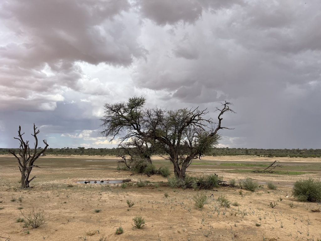 Ons het net klaar uitgepak, toe sak daar ‘n bui reën uit. Wat ‘n lafenis na die dag se hitte! Dit het ons laat waag om vinnig te gaan kyk na die watergat by die skuiling. Ongelukkig het die welige boom van 2016 ook meeste van sy takke verloor en dit was maar ‘n verlate toneel wat ons begroet het.