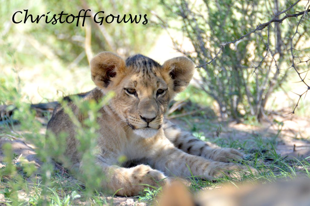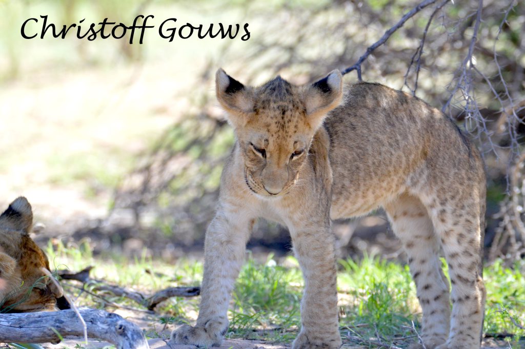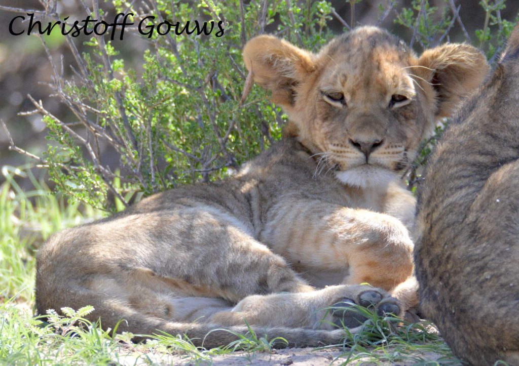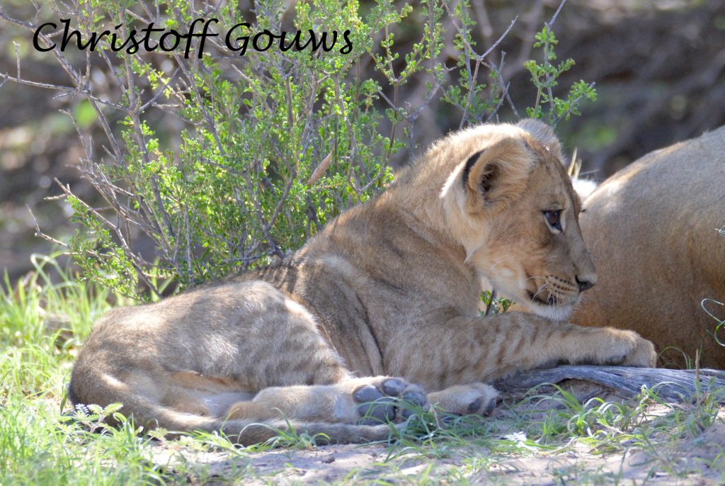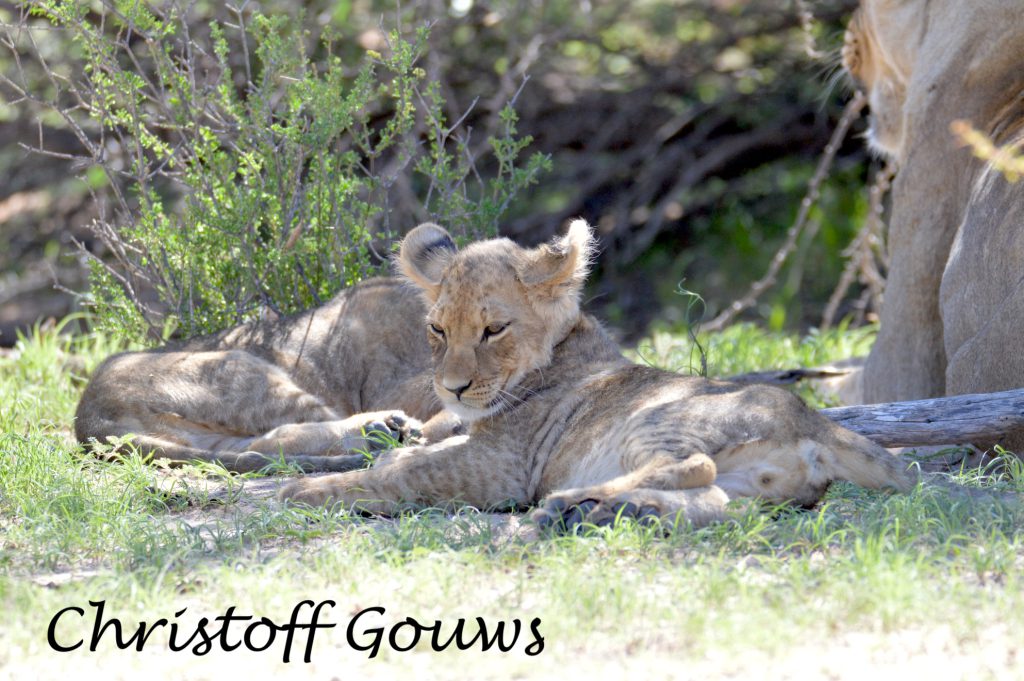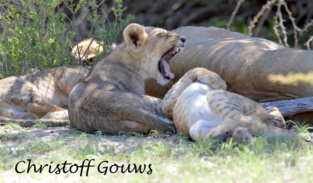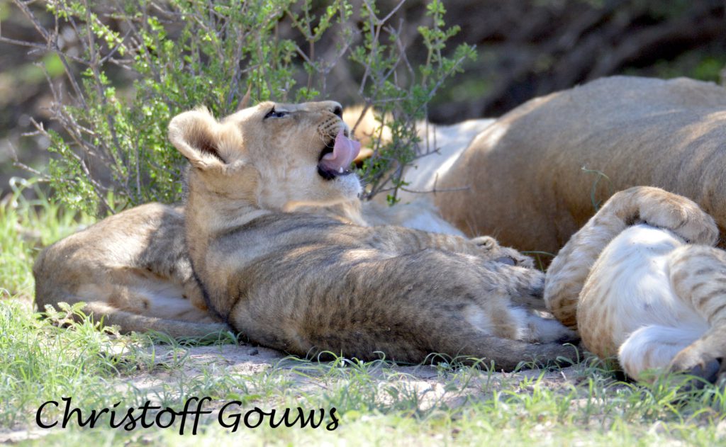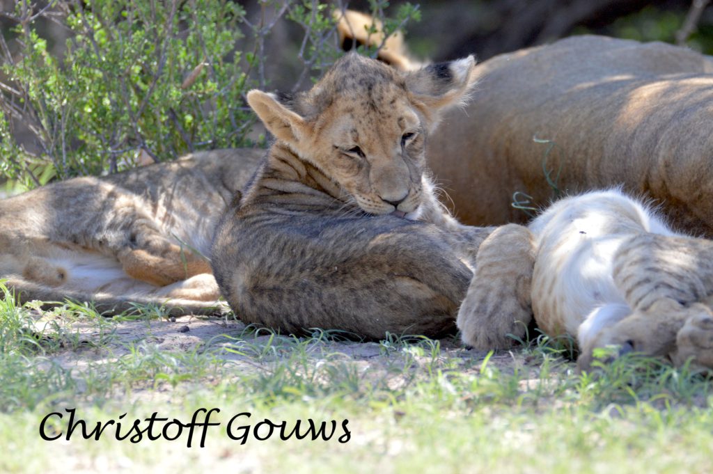 Ons eerste leeuwelpies in die Kgalagadi! Gelukkig vir ons het hulle begin roer, kort na ons daar gestop het en het hulle gesorg vir ‘n paar pragtige fotos! Die eerste een wat wakker geword het, het gegaap, gerek-en-strek en oor ma geklouter. Die ander tweetjies het so bietjie geroer, maar nie veel nie… en tussen alles deur het pa leeu rustig in die koel sand van die padwalletjie bly slaap.
