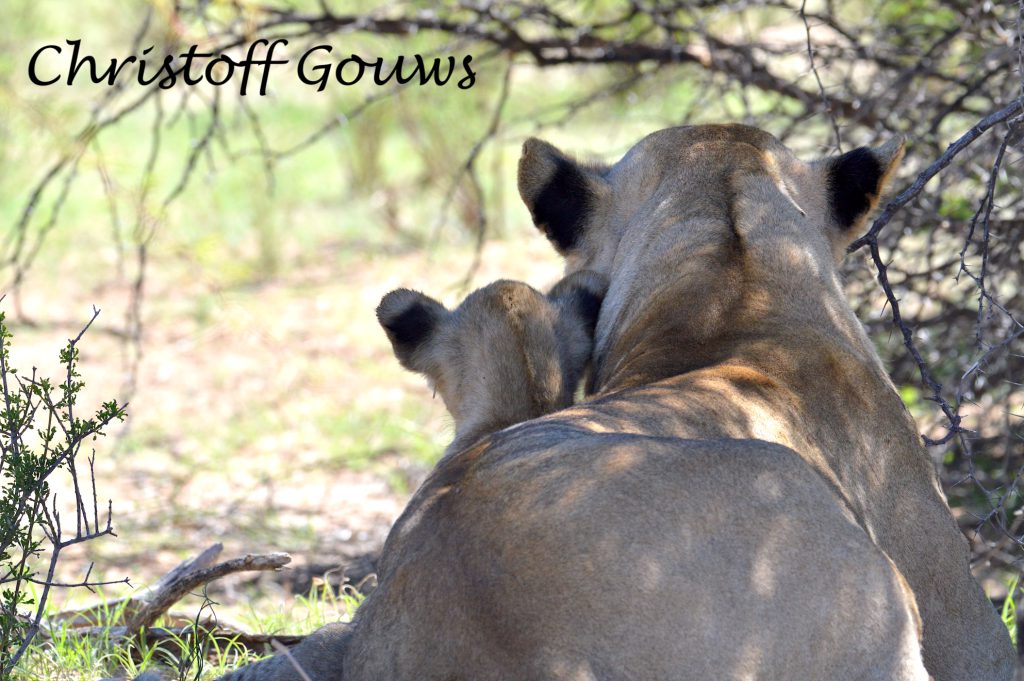 Die hitte het gesorg dat daar geen beweging in die Auob was nie. Selfs kameelperde was skaars… Ons het die langer pad rondom Veertiende boorgat gevat en ons was net op die punt om weer aan te sluit by die hoofroete, toe ons voorgekeer word. Die oom wou net deel dat daar leeus – MET welpies – naby Dertiende boorgat was…