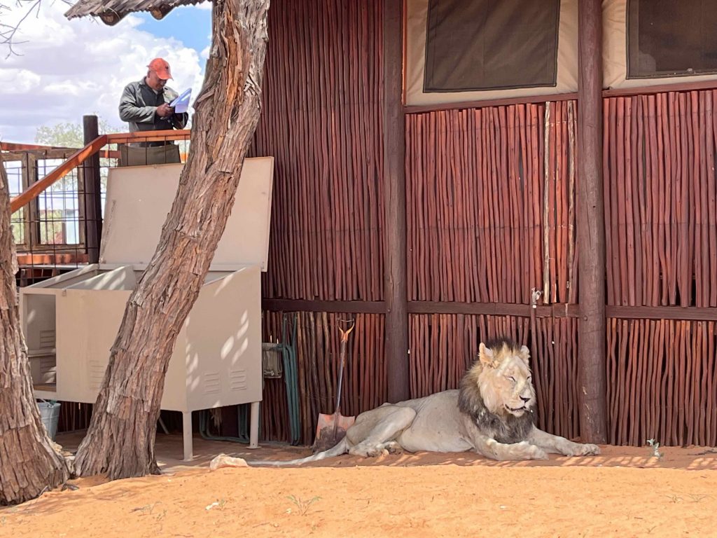 Timothy het kom inloer – nadat sy leeu-wag weggestap het – en kom hoor of alles reg is in die huisie. Hy het verduidelik van die ouer leeumannetjie met die 4 jonger leeumannetjies wat op die oomblik in die kamp se omgewing is. Daar is ook ‘n wyfie met 2 baie klein welpies, wat sy nog moet ronddra en dat sy hulle onder die uitkykpunt se dak wegsteek met tye wanneer hulle gaan jag…