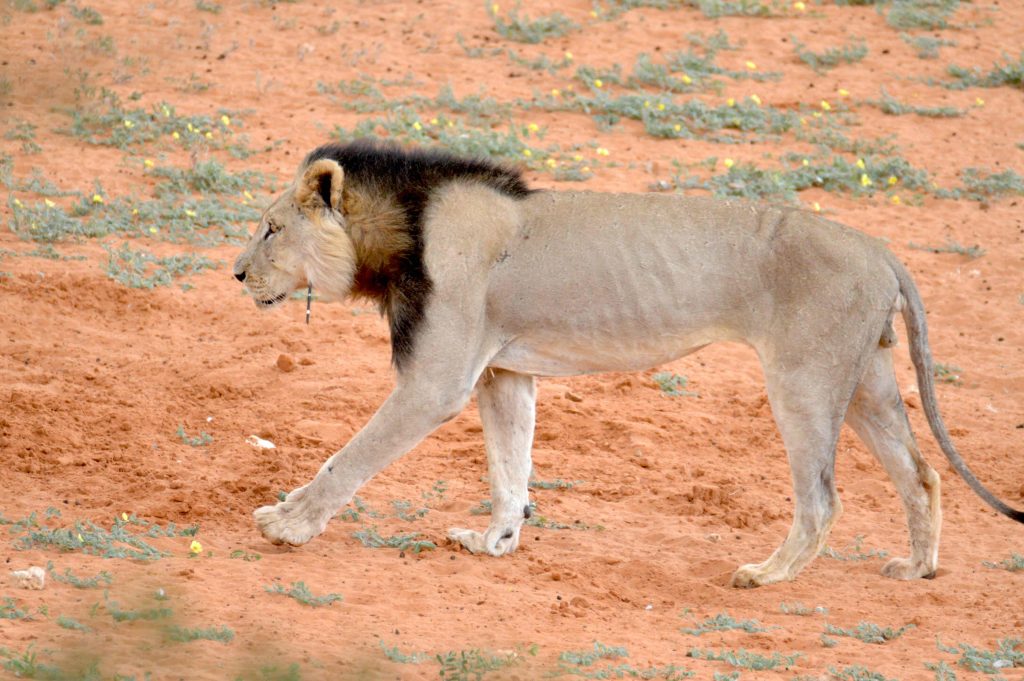 Nadat Timothy weg is, het ons vuur aangesteek. Terwyl ons op die stoepie was was daar ‘n paar jakkalse by die watergat en die leeu het geskuif van struik na duin. Met die oorstap duin toe was dit duidelik hoe uitgeteer die mannetjie was.