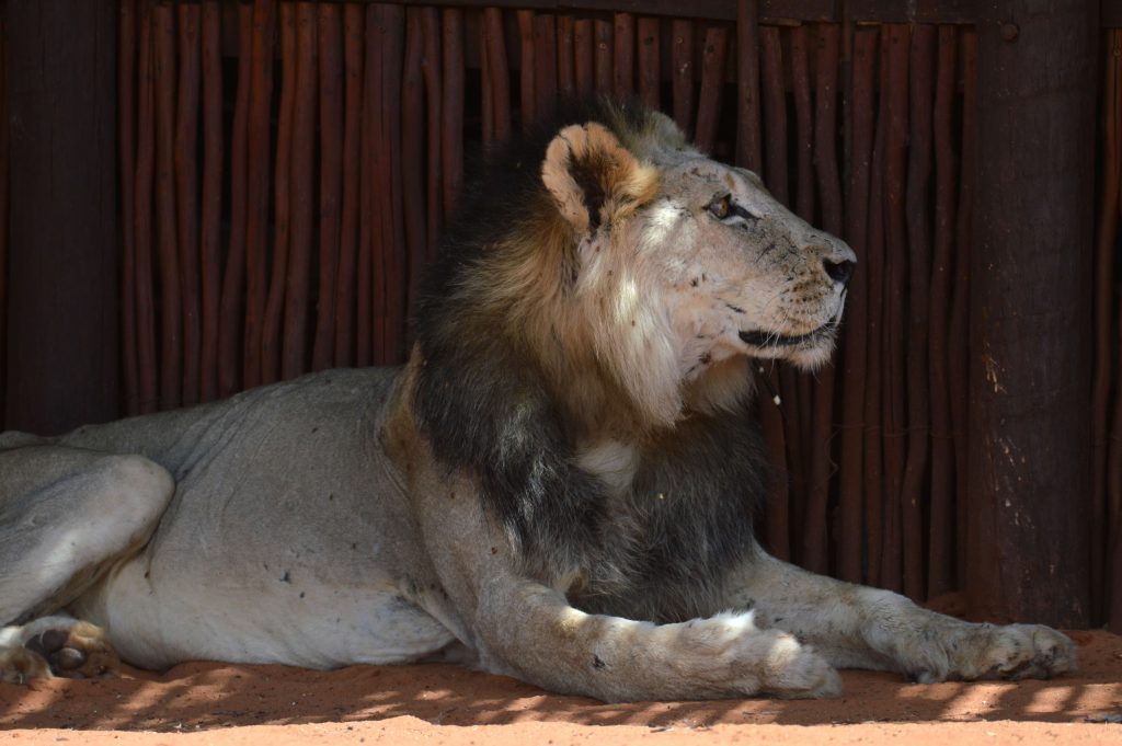 Met die inry in die kamp in, steek ons vas by die opsigter se huisie… In die skadu teen die huisie, lê ‘n leeu! Die maanhaar was maar ongemaklik met ‘n ystervark pen wat agter sy linkerwang uitgesteek het.